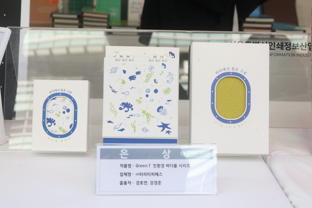 다양한 친환경 인쇄 및 후가공 기술을 적용해 기능적 완성도와 심미성을 높였으며, 해양 생물을 모티브로 한 디자인과 해초 종이 특유의 질감이 잘 조화된 제품입니다.